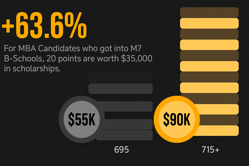 What’s even more interesting is that the scholarship amount multiplies with a higher GMAT score. 715+ scorers at M7 schools receive ~$90,000 in average scholarships, much higher than that received by 695-scorers ($55,000).
